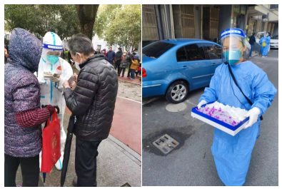 社区志愿岗位哪里缺人万老师就去哪,帮忙统筹安排志愿者工作、核酸检测喊楼现场秩序维护、现场帮老年人预约核酸检测二维码、物资搬运帮送外卖快递、分发抗原试剂等。同时她也是楼组长,要负责上传下达、分发物资、帮老人取药、关心楼组居民居家抗疫日常生活,经常早出晚归。