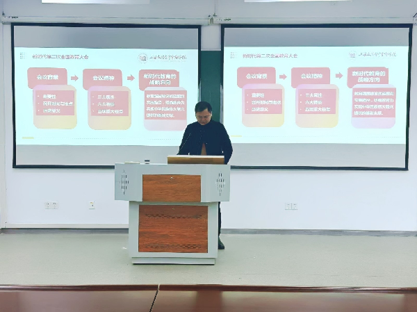 副院长朱海春领学了《学习贯彻习近平总书记关于教育的重要论述和全国教育大会精神》文件内容。朱海春指出,学习贯彻习近平总书记的重要论述和全国教育大会精神,必须将这些精神内化于心、外化于行,贯穿于教育教学全过程,并切实落实到人才培养、科学研究、社会服务和文化传承创新的各项工作中。朱海春要求加大市场调研力度,谋求突破,加强课程体系管理,强化师资队伍和课程信息化建设。