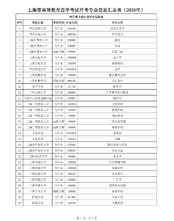 2026年起,执行新考试计划的36个专业(见附件)将开考新计划课程,请考生留意相关变化,做好学业规划。特别提醒,各专业思政课已从2025年起执行新规定,具体详见:关于调整上海市高等教育自学考试思想政治理论课课程设置的通知。